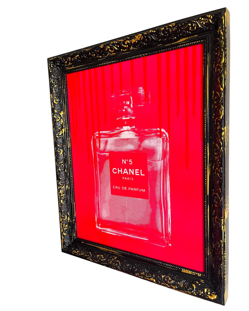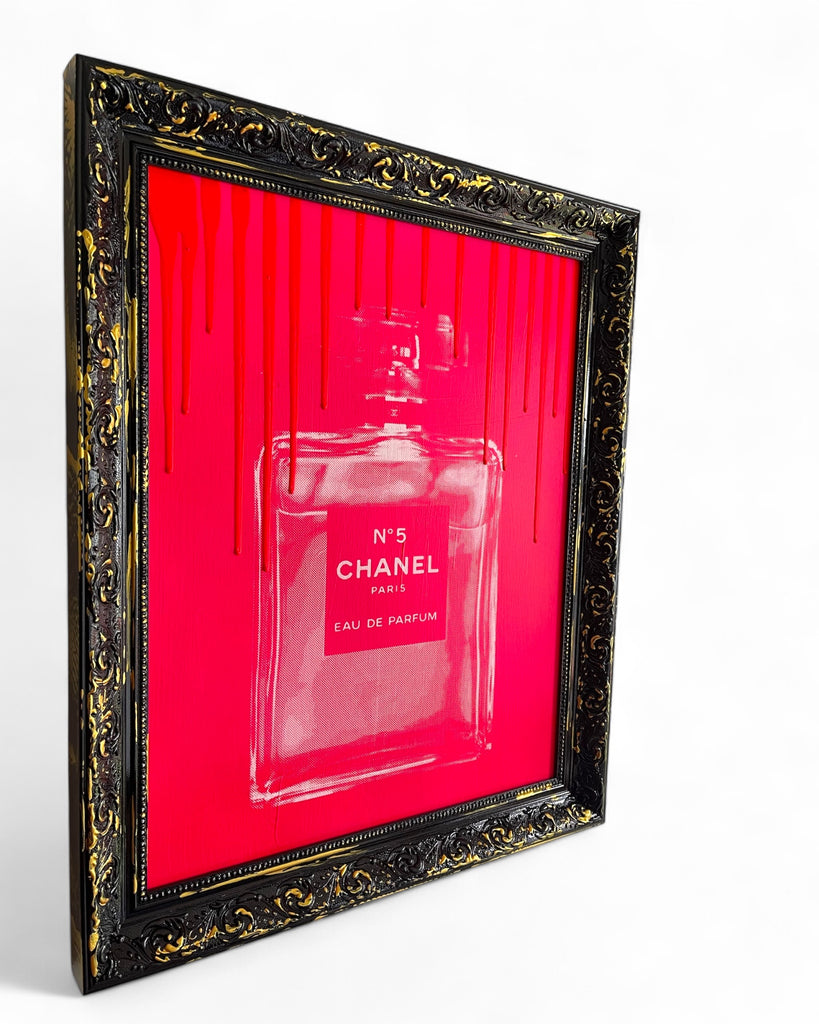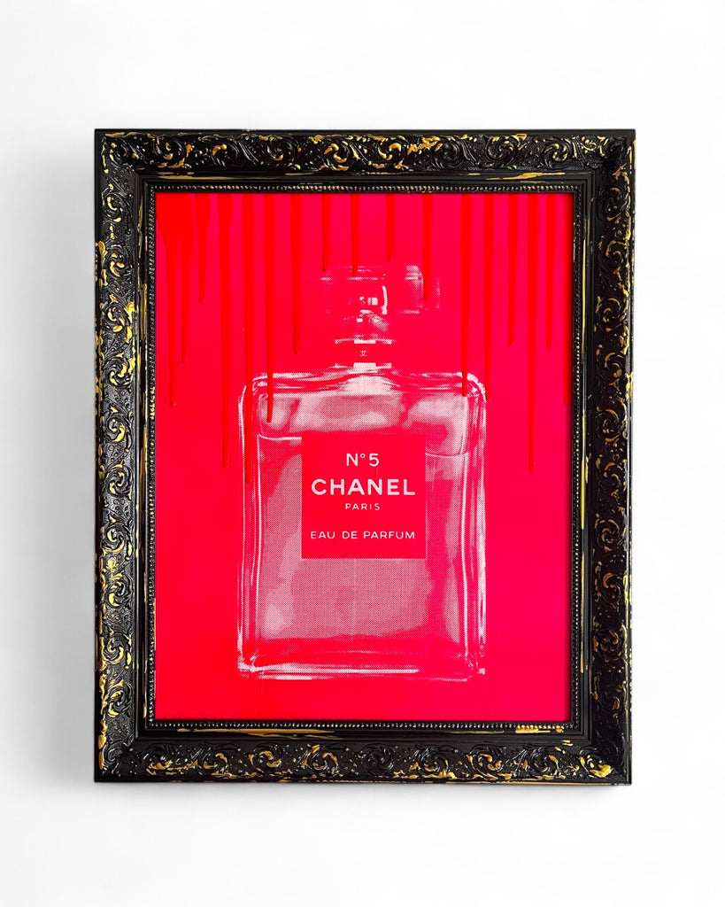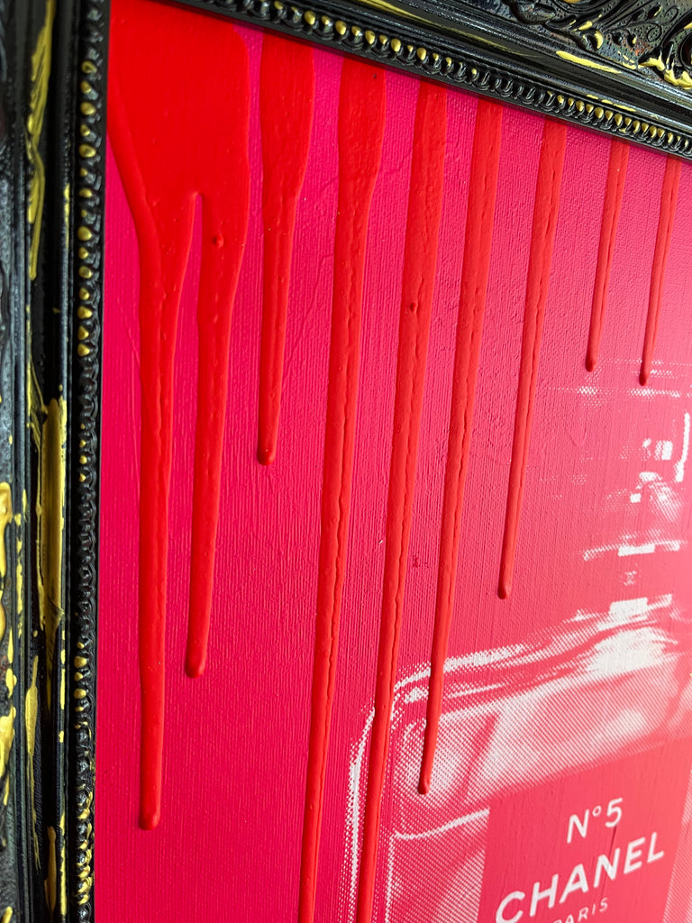 The artwork is created by hand-pulled screenprint on canvas board, then finished with hand-applied paint drips.