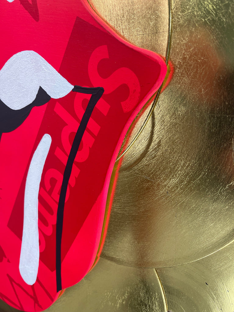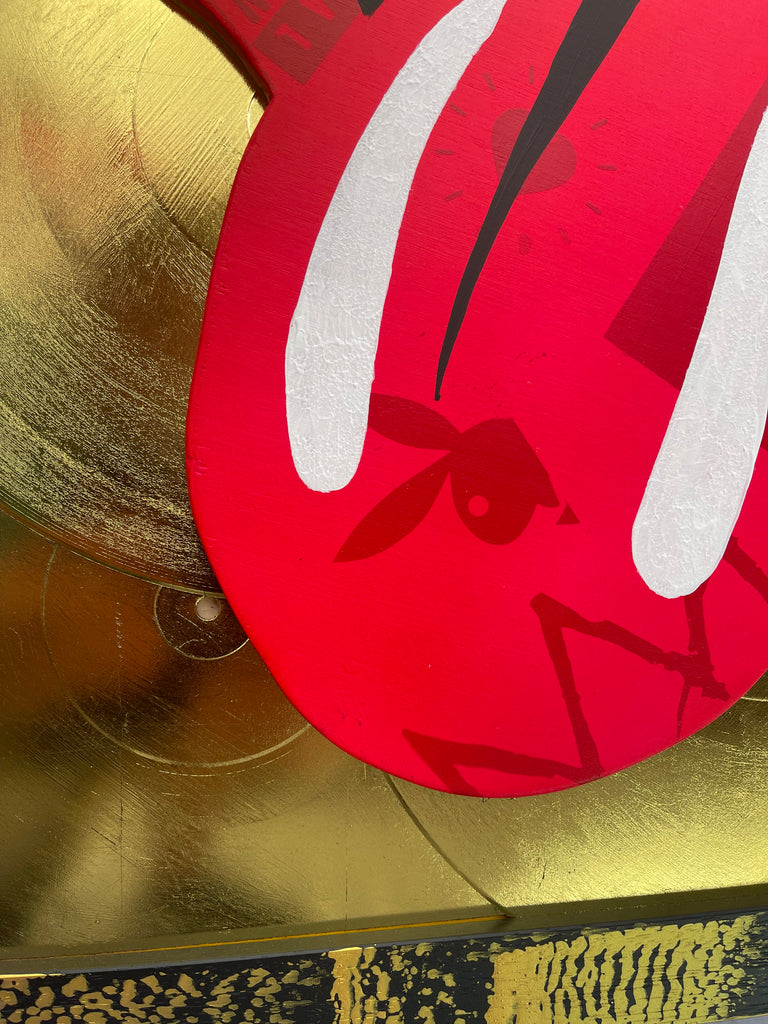 This piece is my tribute to one of the most iconic bands in rock history — The Rolling Stones. The bold tongue-and-lips logo is painted on a hand-cut hardwood panel and placed against a shimmering background of real vinyl records, finished with gold leaf for extra punch.