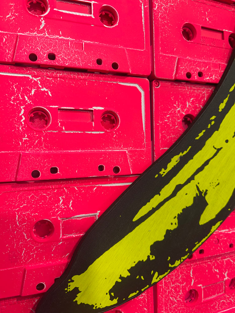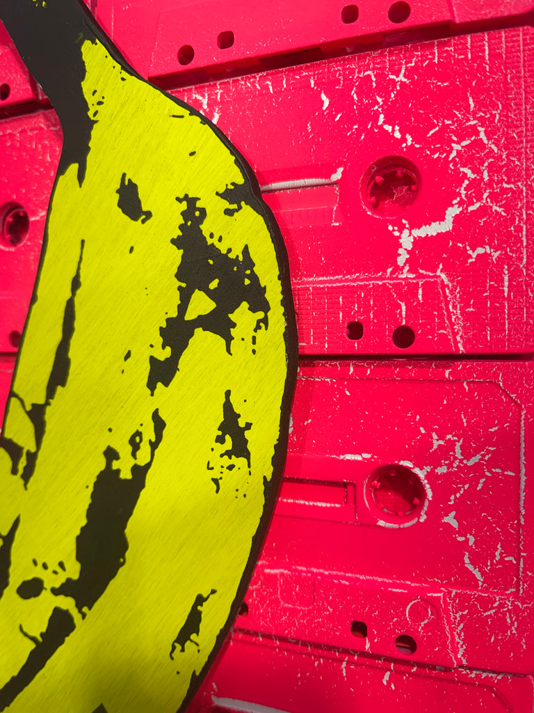 This artwork is my tribute to one of the most influential bands of all time — The Velvet Underground. The iconic banana is recreated as a hand-pulled silkscreen on hardwood panel, cut out for a 3D effect, and mounted on a backdrop of bold pink cassette tapes.